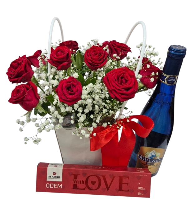 מארז יין שוקולד ופרחים