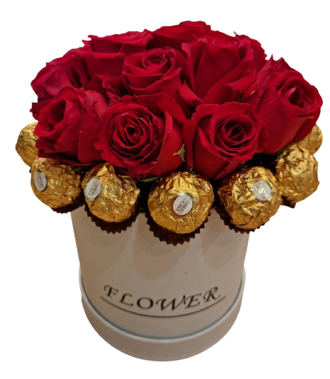 סידור מתוק המשלב ורדים אדומים ופררו רושר המגיע בקופסא במגוון גדלים