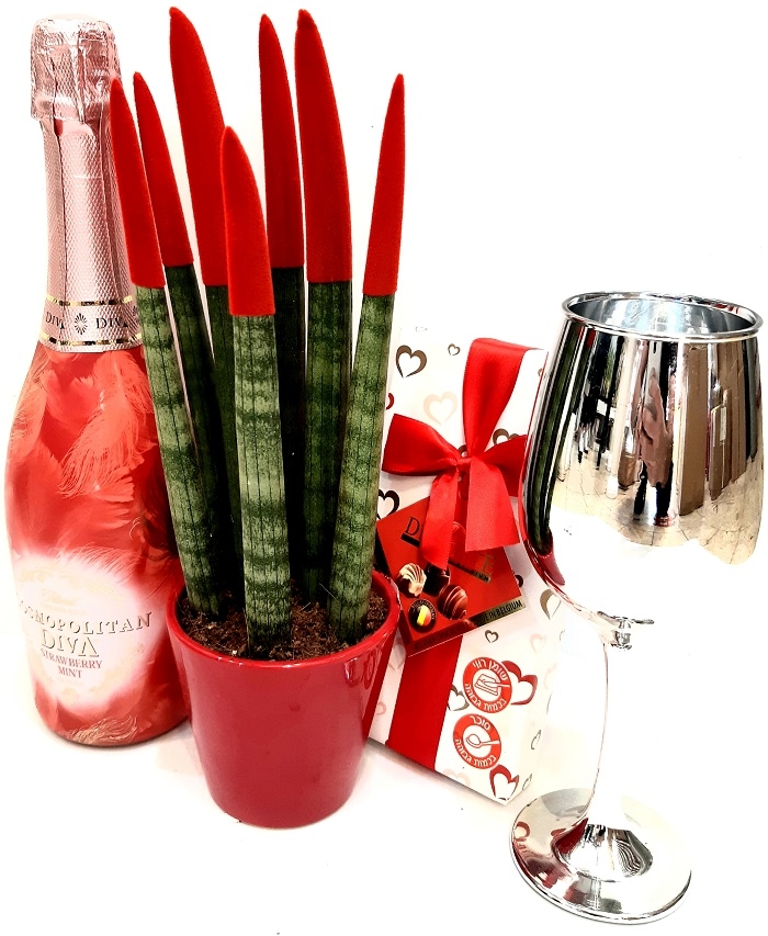 עציץ סנסיבריה שמפניה מארז שוקולד בלגי וכוס שמפניה