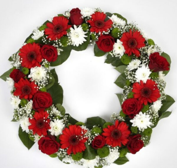 זר אבל המורכב מפרחי גרברה אדום ורדים אדומים כריזנטמות לבנות בתוספת ירק