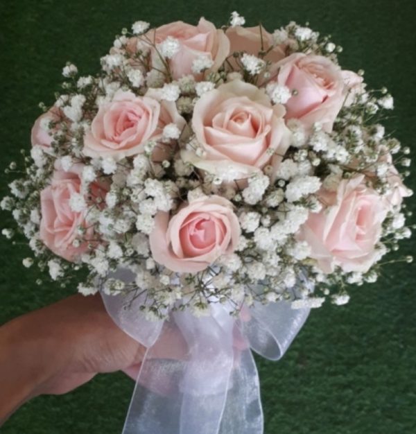 זר כלה המכיל בין12-18 ורדים+ גיפסנית עם טול מסביב