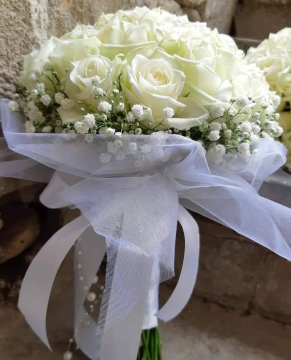 זר כלה המכיל כ25-35 ורדים לבנים בתוספת גיפסנית לבנה וטול מסביב