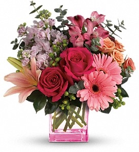 מרובע המורכב מפרחי גרברה ליליות ורדים