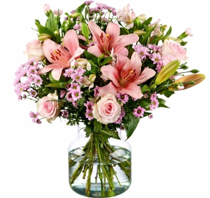 כריזנטמות סגולות וורדים ורודים בתוספת
