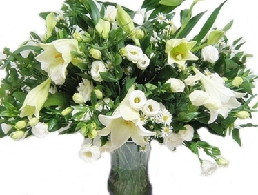 זר לבן המשלב בתוכו שושן צחור ליזיאנטוס לבן וענפי ירק
