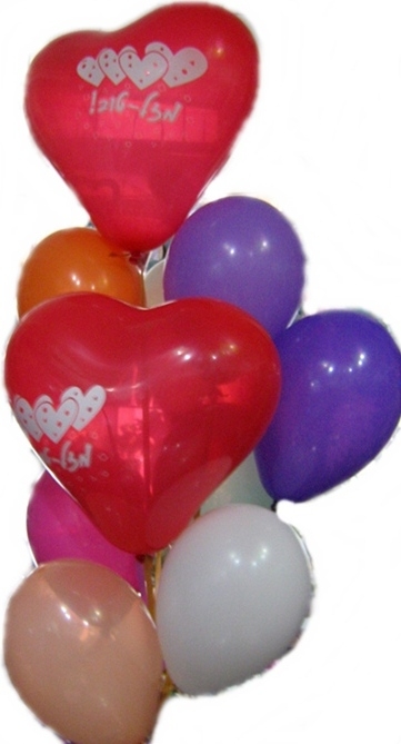 זר בלונים המורכב מ-2 בלוני גומי בצורת לב ועוד 6 בלונים צבעונים.