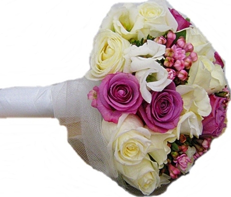 זר כלה בסגנון סגול לבן המורכב מורדים לבנים סגולים וליזיאנטוס לבן.